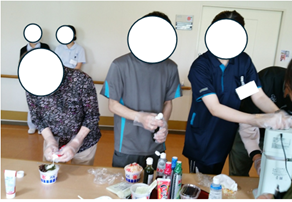 今年から電動のかき氷機を導入し、かき氷の器はスタッフが付き添いをしながら患者様でそれぞれ回してもらいました。シロップはメロンやイチゴ、ブルーハワイ、抹茶を用意しトッピングにはあんこやバニラアイス、練乳を用意しそれぞれ好きなトッピングをして楽しまれていました。
