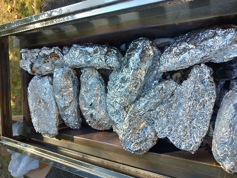 その日は天気が良くてとても暖かく、外で過ごすのにぴったりな一日でした。芋はまず濡れた新聞紙で包んでその上からアルミホイルで包んでおきます。そして炭に火をおこすのですが、まる焦げにならないように炭の火が落ち着いてから芋を炭に乗せて弱火でじっくりと焼いていきます。1時間ほどすると芋の甘いにおいがして触った感じが柔らかくなっていたら焼き芋の完成です。