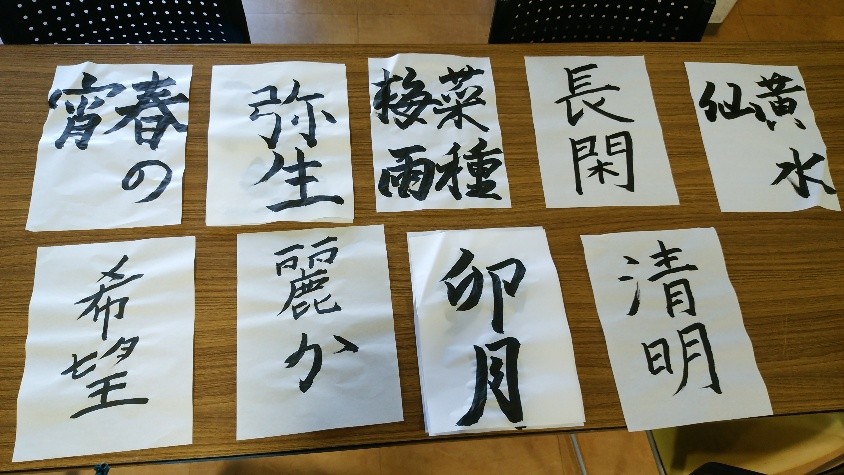 作品が完成すると、「こっちがうまく出来たから飾ってね」とご自分から展示用の作品を渡される方もいらっしゃいました。皆さんの毎月の作品は、塗り絵等と一緒に廊下に展示をしています。今月もたくさんの素敵な作品で賑やかになりそうです。今後も季節を感じながら、穏やかな書道の時間を皆さんと継続していきたいと思います。
